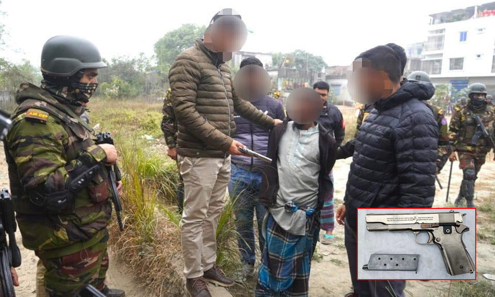 পোস্টে বলা হয়েছে, সুনির্দিষ্ট গোয়েন্দা তথ্যের ভিত্তিতে বাংলাদেশ সেনাবাহিনীর একটি দল ঢাকার ইকুরিয়া থানা, বনগ্রাম বাজার, কেরানীগঞ্জ এলাকায় অভিযান চালিয়ে একটি নির্মাণাধীন ভবন থেকে মো. সোলাইমান হোসেন শুভ (২৮) এবং মো. মোফাজ্জেল হোসেন (৩০) নামের দুই ব্যক্তিকে একটি বিদেশি পিস্তল ও একটি ম্যাগাজিনসহ গ্রেপ্তার করে।