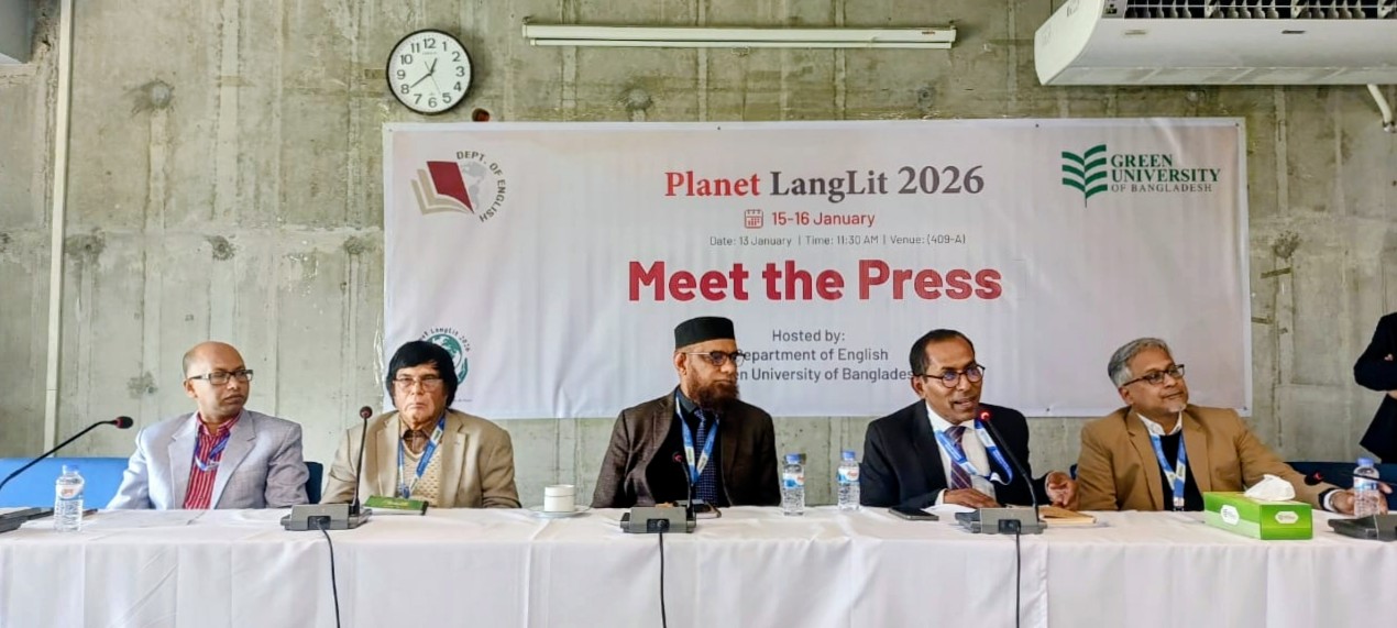 মোঃ আবু কাওছার মিঠু, রূপগঞ্জ নারায়ণগঞ্জ প্রতিনিধিঃ গবেষণায় নতুন দিগন্ত বিশ্বের ৪০০ গবেষককে নিয়ে প্ল্যানেট ল্যাংলিট ২০২৬-এর অংশ হিসেবে আন্তর্জাতিক সম্মেলনের আয়োজন করতে যাচ্ছে গ্রিন ইউনিভার্সিটি অব বাংলাদেশ। মঙ্গলবার(১৩ জানুয়ারী) দুপুরে গ্রিন ইউনিভার্সিটি অব বাংলাদেশ রূপগঞ্জ স্থানী ক্যাম্পাসের সভা কক্ষে এক সংবাদ সম্মেলনে প্ল্যানেট ল্যাংলিটের আহ্বায়ক ড. মো. শামিম মণ্ডল সম্মেলনটির বিস্তারিত তথ্য তুলে ধরেন।