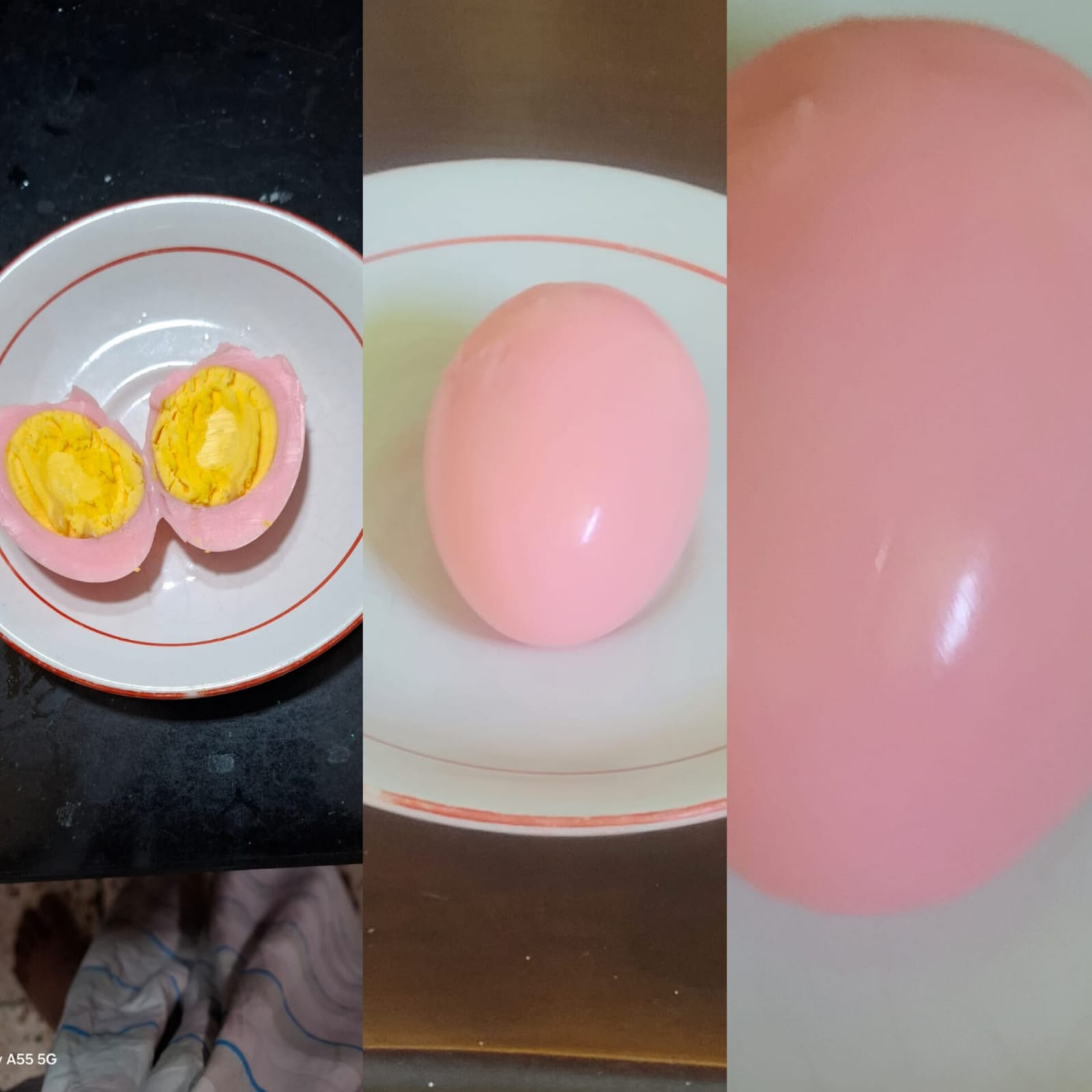সাধারণ রঙের হাঁসের ডিম মনে হলেও, যখন সেদ্ধ করে খোসা ছাড়ানো হয়, তখন একটি ডিমের ভেতরের সাদা অংশ হঠাৎ করে গোলাপি রঙের দেখা যায়, যা দেখে পরিবারসহ নিয়ে আতঙ্ক ছড়ায়।