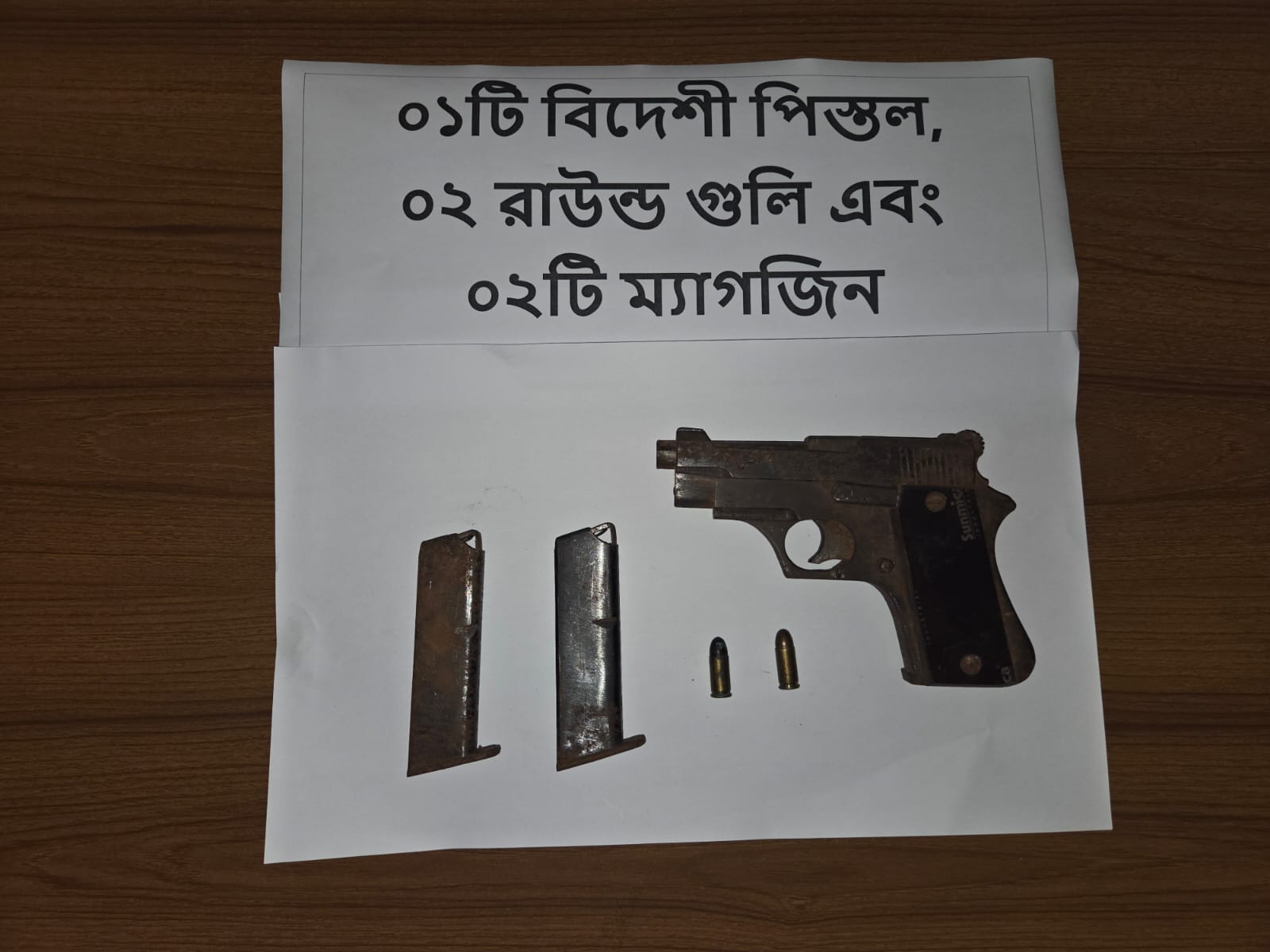 উদ্ধারকৃত পিস্তলের বাটের দৈর্ঘ্য ৭ ইঞ্চি। পিস্তলের উপর ইংরেজিতে “Sunmica Industrial” লেখা রয়েছে। ব্যারেলের এক পাশে “MADE IN U.S.A” এবং অপর পাশে “7.65” লেখা আছে। এছাড়াও ঘটনাস্থল থেকে ৭.৬৫ এমএম ক্যালিবারের ২ রাউন্ড গুলি উদ্ধার করা হয়, যার প্রতিটির পেছনে “KF 7.65” লেখা রয়েছে। পাশাপাশি পরিত্যক্ত অবস্থায় ২টি ম্যাগাজিনও উদ্ধার করা হয়।