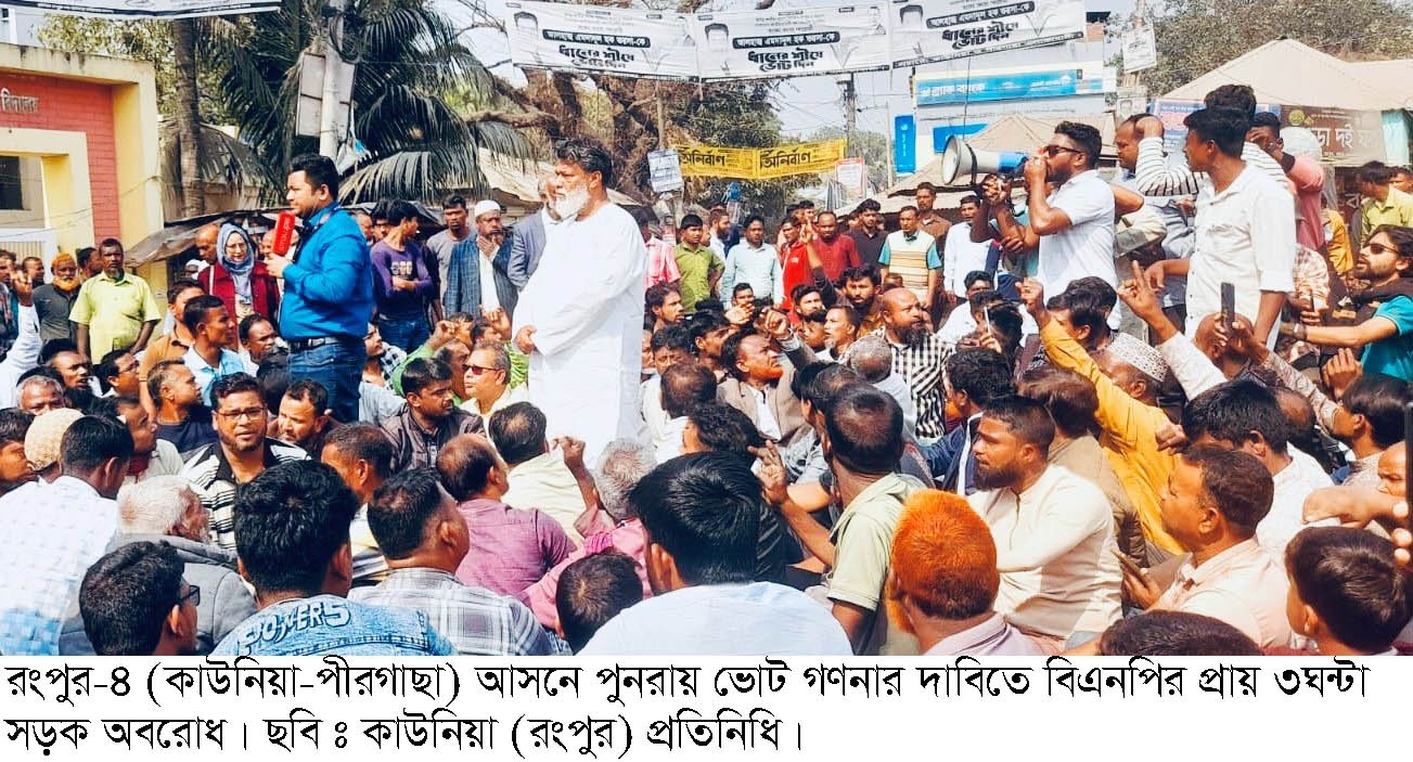 কাউনিয়া (রংপুর) প্রতিনিধি: রংপুর-৪ (কাউনিয়া-পীরগাছা) আসনে ভোট কারচুপি ও পুনরায় ভোট গণনার দাবিতে কাউনিয়া বালিকা বিদ্যালয় মোড় রংপুর-কুড়িগ্রাম মহাসড়ক শনিবার ১২টা থেকে প্রায় ৩ঘন্টা অবরোধ করে বিক্ষোভ করে ধানের শীষ প্রতীকের প্রার্থী এমদাদুল হক ভরসাসহ বিএনপির নেতা কর্মী ও হাজার হাজার সমর্থকরা।