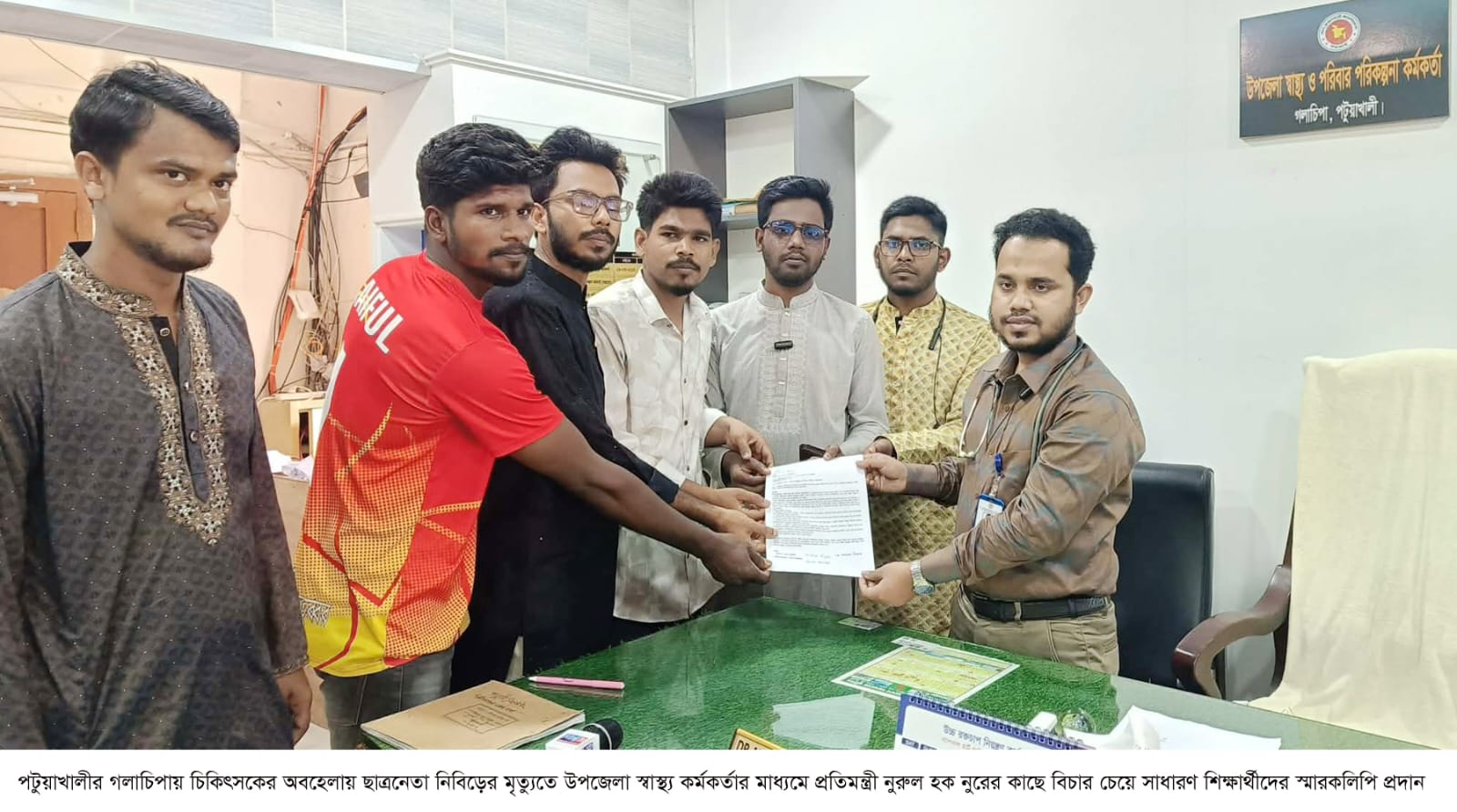 স্মারকলিপিতে শিক্ষার্থীরা উল্লেখ করেন, গত ৯ মার্চ জ্বর ও ডায়রিয়া নিয়ে রাঙ্গাবালী উপজেলার ছাত্রদল নেতা নিবিড় গলাচিপা উপজেলা স্বাস্হ্য কমপ্লেক্সে ভর্তি হন। এসময় চিকিৎসকের চরম অবহেলায় নিবিড়ের মর্মান্তিক মৃত্যুর অভিযোগ উঠে। চিকিৎসা সেবার মতো মানবিক পেশায় এ ধরনের দায়িত্বজ্ঞানহীনতা কোনোভাবেই কাম্য নয়। এ ঘটনায় স্হানীয় শিক্ষার্থী ও সাধারণ মানুষের মধ্যে তীব্র ক্ষোভ ও চিকিৎসা ব্যবস্হার প্রতি চরম আস্হাহীনতার সৃষ্টি হয়েছে।