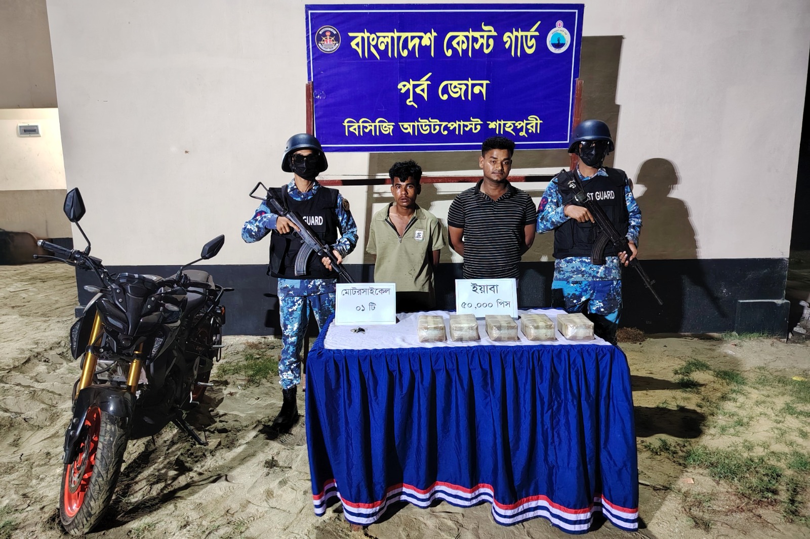 আটকদের কাছ থেকে একটি বস্তা তল্লাশি করে প্রায় ৫০ হাজার পিস ইয়াবা উদ্ধার করা হয়, যার আনুমানিক বাজারমূল্য ২ কোটি ৫৫ লাখ টাকা।